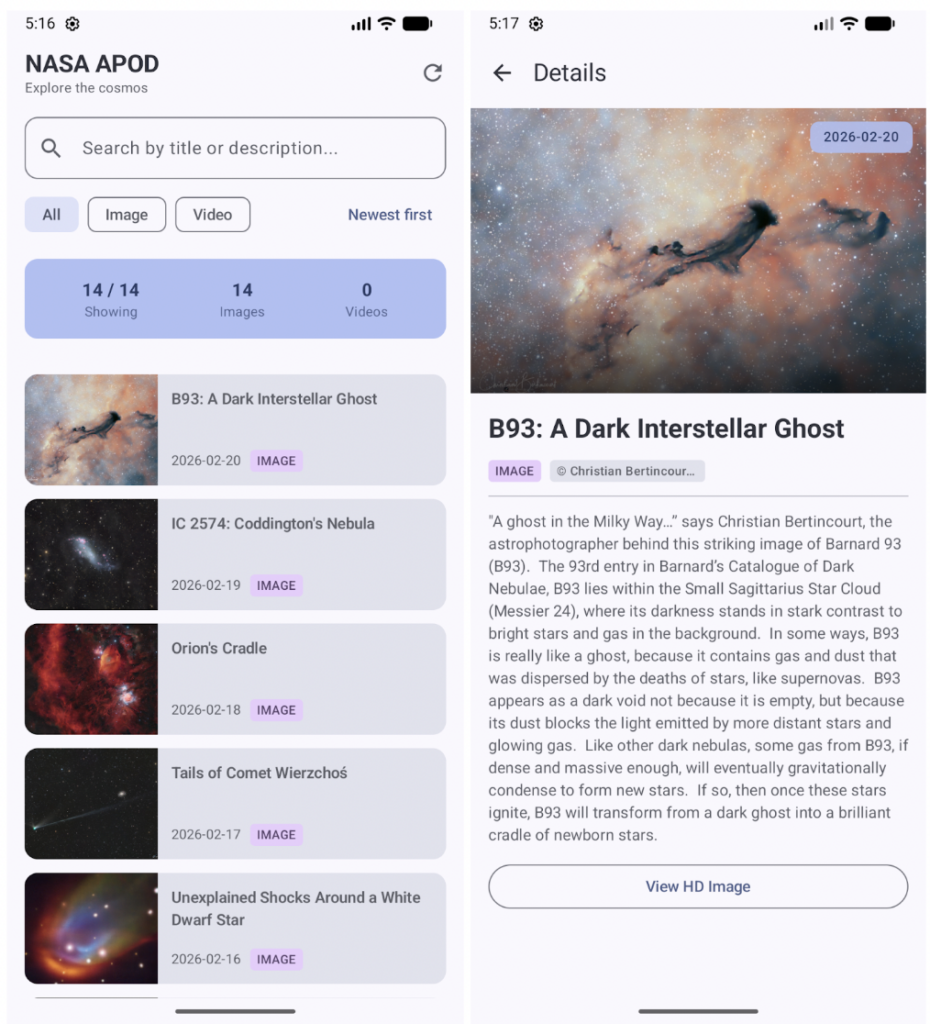 - Recupero dati in tempo reale dalle API della NASA.